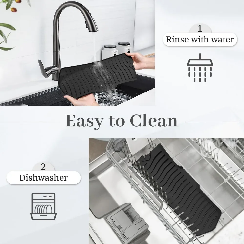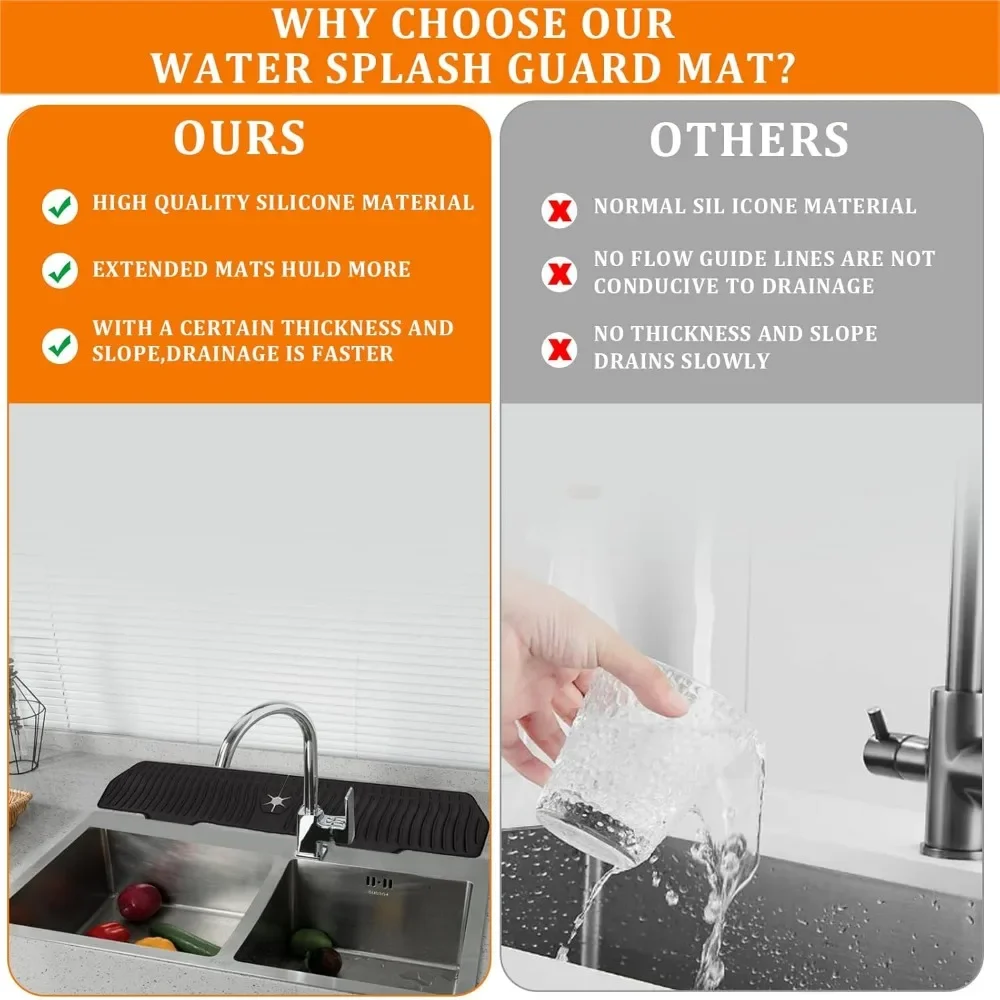 【Use as an Organizer Mat】The splash guard has enough room in each side for soap, scrub brush, sponges and soap dispensers. The silicone mat allows the water from sponges to drip into the sink and keeps water off the granite! And silicone faucet drainer pad prevents soap dispensers from leaving stains on kitchen counters.