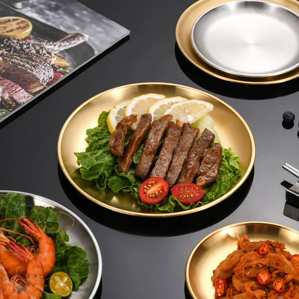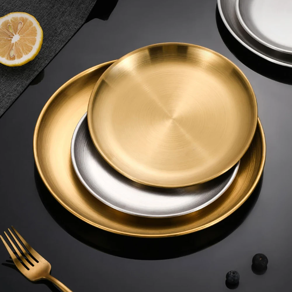 Korean Stainless Steel Disc Golden Cafe Tray Fruit Plate Cake Plate Bone Shallow Plate Snack Kitchen Home Outdoor Dinner Plate